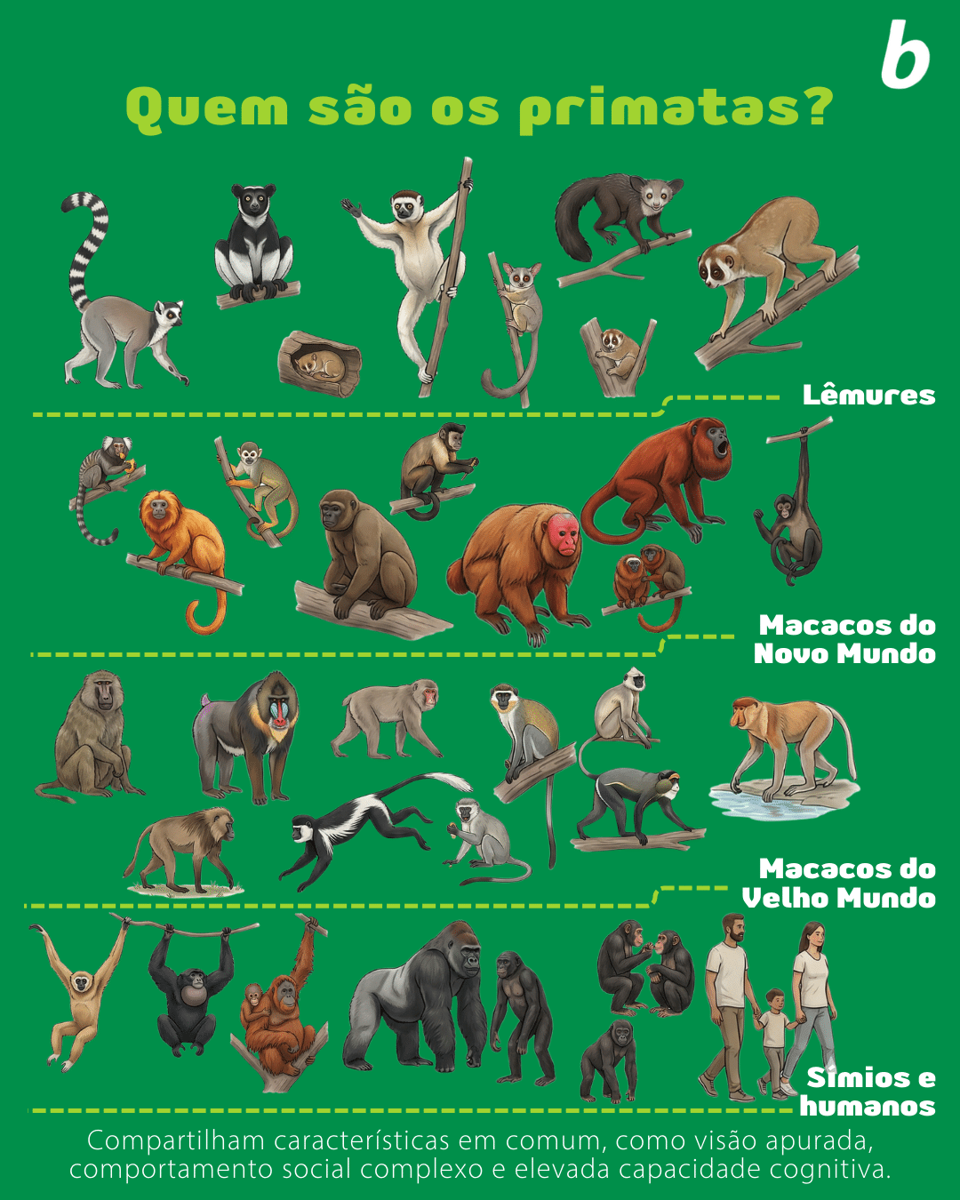 Quando falamos em primatas, nos referimos ao grupo como um todo, a Ordem Primates, que se divide em diferentes subgrupos, desde os lêmures de Madagascar, passando pelos pequenos tarsos, até os grandes hominóideos (normalmente também chamados de símios), como chimpanzés, gorilas e orangotangos.